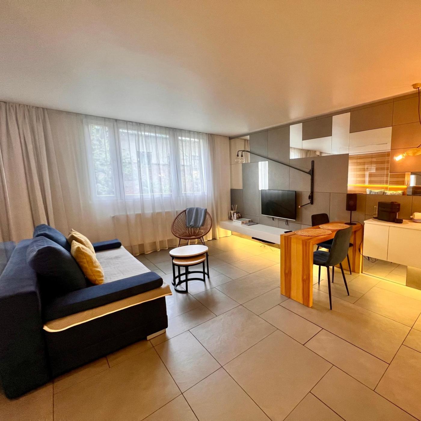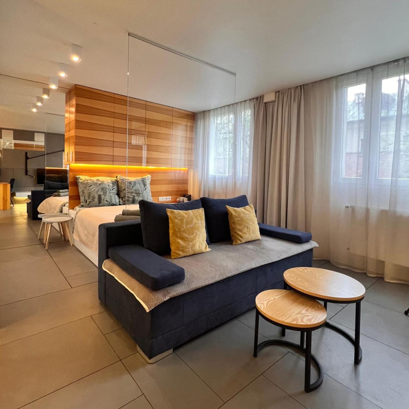 Apartament dwuosobowy typu Studio Deluxe. The studio features a private bathroom, a washing machine, a private entrance, as well as a seating area with a flat-screen TV. The well-equipped kitchen has a stovetop, a refrigerator, a dishwasher and kitchenware. The studio offers a tea and coffee maker, a dining area, a wardrobe along with a sofa. The unit offers 1 bed. Studio - 2 osobowy. Powierzchnia pokoju ok.: 37 mkw.